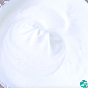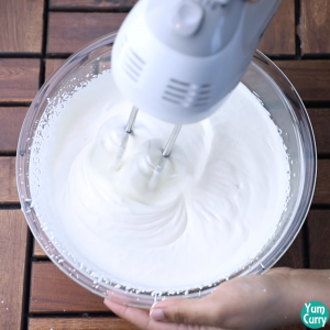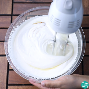 - Take the chilled bowl and add chilled whipping cream to it. Beat it using an electric hand blender until stiff peaks formed.
