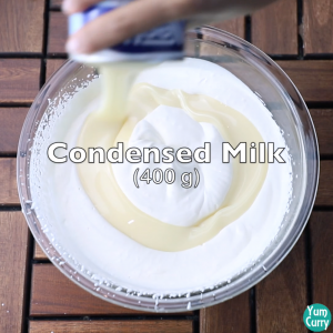 - Add chilled sweetened condensed milk and vanilla essence/extract to it. Mix well using the blender.