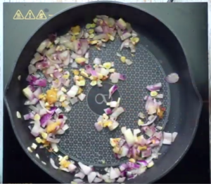 - Toss a tsp of garlic and ginger, with a cup of chopped onion in the pan till they turn golden brown.