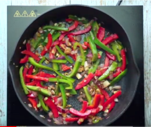 - Then add a cup of sliced red bell peppers and capsicum to the pan and cook them well.