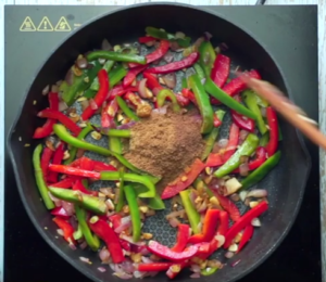 - Secondly, add a cup of sliced bell peppers and capsicum to the pan. Cook them well.